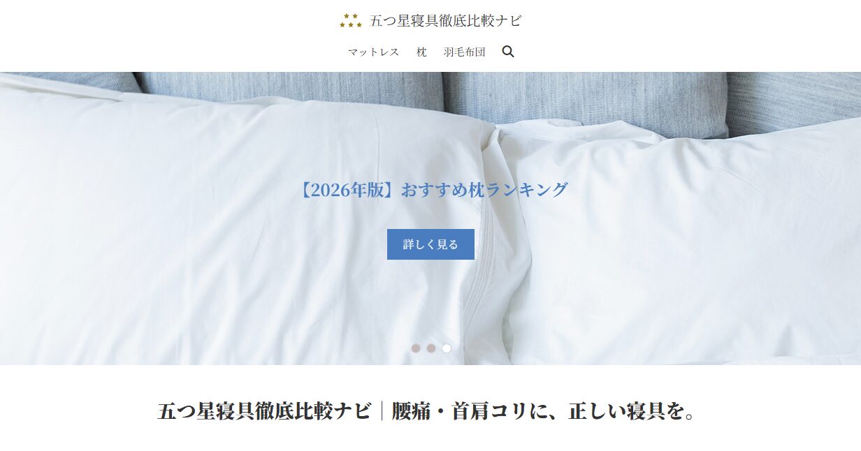 五つ星寝具徹底比較ナビは、マットレス・枕・羽毛布団などの寝具について、仕様や特性をわかりやすく比較・解説する専門情報メディアです。体重や寝姿勢に合った寝具の選び方やランキング・基礎知識などを通じて、腰痛や首肩コリなどの悩みに合った最適な寝具選びをサポートします。信頼性の高い比較情報を提供しています。